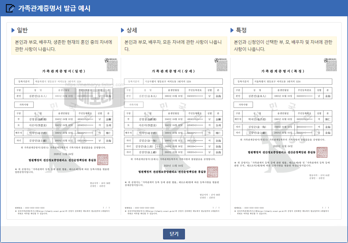 일반증명서, 상세증명서, 특정증명서 발급 예시