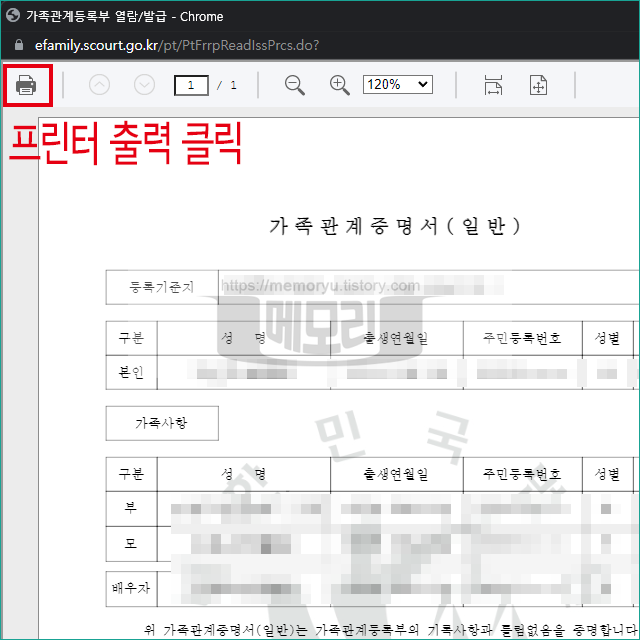 가족관계증명서가 미리보기로 화면에 나타납니다. 좌측 상단에 프린터 모양의 아이콘을 눌러 출력을 진행합니다.