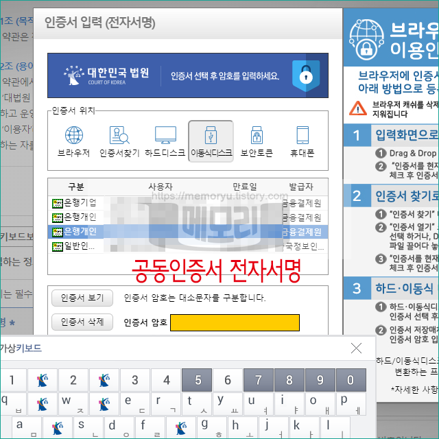 다음 단계는 공동인증서로 전자서명을 하는 단계입니다. 컴퓨터 또는 외장저장장치에 저장되어 있는 공동인증서를 불러온 후, 인증서 암호를 입력해 전자서명을 합니다.