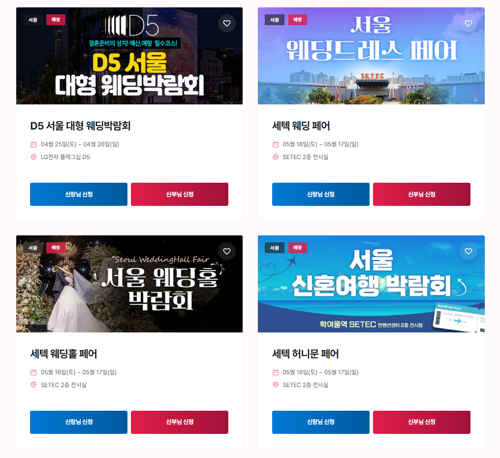 - 서울 웨딩홀 박람회: 강남권 인기 웨딩홀의 잔여 타임과 박람회 한정 프로모션을 확인할 수 있습니다.