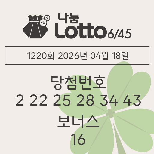 로또 6/45 1220회 당첨번호가 발표되었습니다. 2026년 04월 18일에 추첨된 이번 주 로또당첨번호와 당첨금액, 1등 배출 판매점 정보를 상세히 안내해드립니다. 동행복권 로또645 구매자 여러분의 당첨 여부를 확인해보세요.