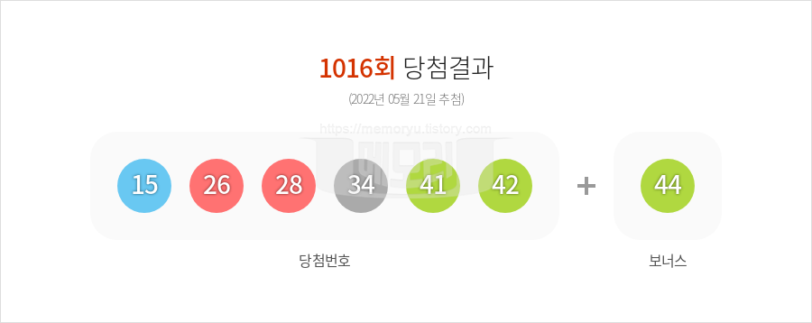 (주)동행복권에서 시행하는 로또 6/45 1016회(2022년 05월 21일 추첨)의 당첨 결과(복권 총 판매액과 등위별 당첨금액, 1등 당첨자 배출 판매점 등)가 나왔습니다. 1016회 로또복권 총 판매액은 101,583,153,000원입니다. 행운의 로또 1등 당첨 번호는 15, 26, 28, 34, 41, 42 입니다. 2등 보너스 번호는 44입니다. 당첨 되신 분들 정말 정말 축하합니다. 당첨금이 3억원을 초과하는 1등의 경우 33%의 세금을 공제하고 당첨금을 지급합니다. 2등과 3등은 보통 3억이 넘지 않기 때문에 22%의 새금이 매겨집니다. 4등과 5등은 당첨금이 5만원 이하 이기에 세금을 부과하지 않고 당첨금을 모두 받을 수 있습니다.