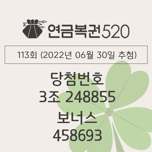수탁사업자 (주)동행복권에서 주관하는 연금복권720+ 113회(2022년 06월 30일 추첨) 당첨 결과가 나왔습니다. 매월 700만 원을 20년 동안 꼬박꼬박 통장에 꽂아 줄 113회 연금복권 1등 당첨번호는 3조 248855입니다. 2등은 조 단위와 상관없이 6자리가 일치하면 2등입니다. 2등과 동일한 당첨 혜택을 주는 보너스 번호는 458693입니다. 1등과 2등, 보너스 당첨자 그리고 3등부터 7등까지 당첨되신 모든 분들 정말 축하합니다. 연금복권은 로또645처럼 당첨금을 한 번에 지급하는 게 아닌 정해진 기간 동안 매달 분할 지급하는 방식입니다. 지급방식이 연금과 흡사해 연금복권이라 부릅니다. 1등은 매월 700만원을 20년간, 2등과 보너스는 매월 100만원을 10년간 지급합니다. 3등 부터는 당첨금이 다소 적기 때문에 일시금으로 지급합니다.