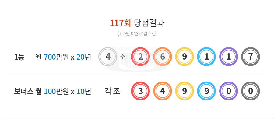 수탁사업자 (주)동행복권에서 주관하는 연금복권720+ 117회(2022년 07월 28일 추첨) 당첨 결과가 나왔습니다. 매월 700만 원을 20년 동안 꼬박꼬박 통장에 꽂아 줄 117회 연금복권 1등 당첨번호는 4조 269117입니다. 2등은 조 단위와 상관없이 6자리가 일치하면 2등입니다. 2등과 동일한 당첨 혜택을 주는 보너스 번호는 349900입니다. 1등과 2등, 보너스 당첨자 그리고 3등부터 7등까지 당첨되신 모든 분들 정말 축하합니다. 연금복권은 로또645처럼 당첨금을 한 번에 지급하는 게 아닌 정해진 기간 동안 매달 분할 지급하는 방식입니다. 지급방식이 연금과 흡사해 연금복권이라 부릅니다. 1등은 매월 700만원을 20년간, 2등과 보너스는 매월 100만원을 10년간 지급합니다. 3등 부터는 당첨금이 다소 적기 때문에 일시금으로 지급합니다.