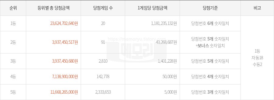 • 1등 당첨 기준: 당첨번호 6개 모두 일치